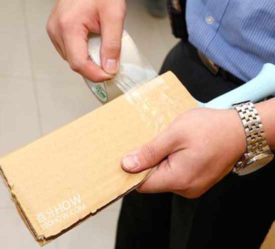 b、再把厚紙板完整包覆住刀身后,讓刀鋒朝向瓦楞紙的折痕處,并用膠帶封緊開口。